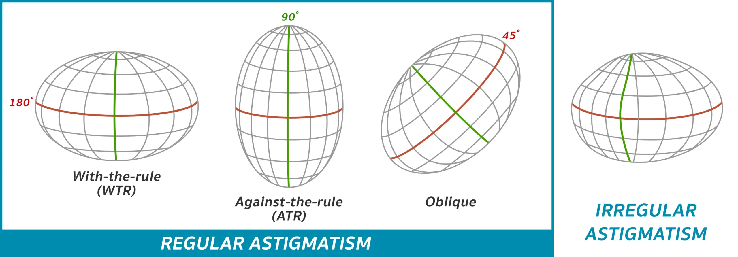 สายตาเอียงที่คนส่วนใหญ่เป็นกันคือ แบบสม่ำเสมอ (Regular) ซึ่งเป็นแบบที่เราสามารถวัด 'องศา' ได้แม่นยำ โดยแบ่งออกได้เป็น 5 ประเภทย่อยตามลักษณะการตกของแสง
