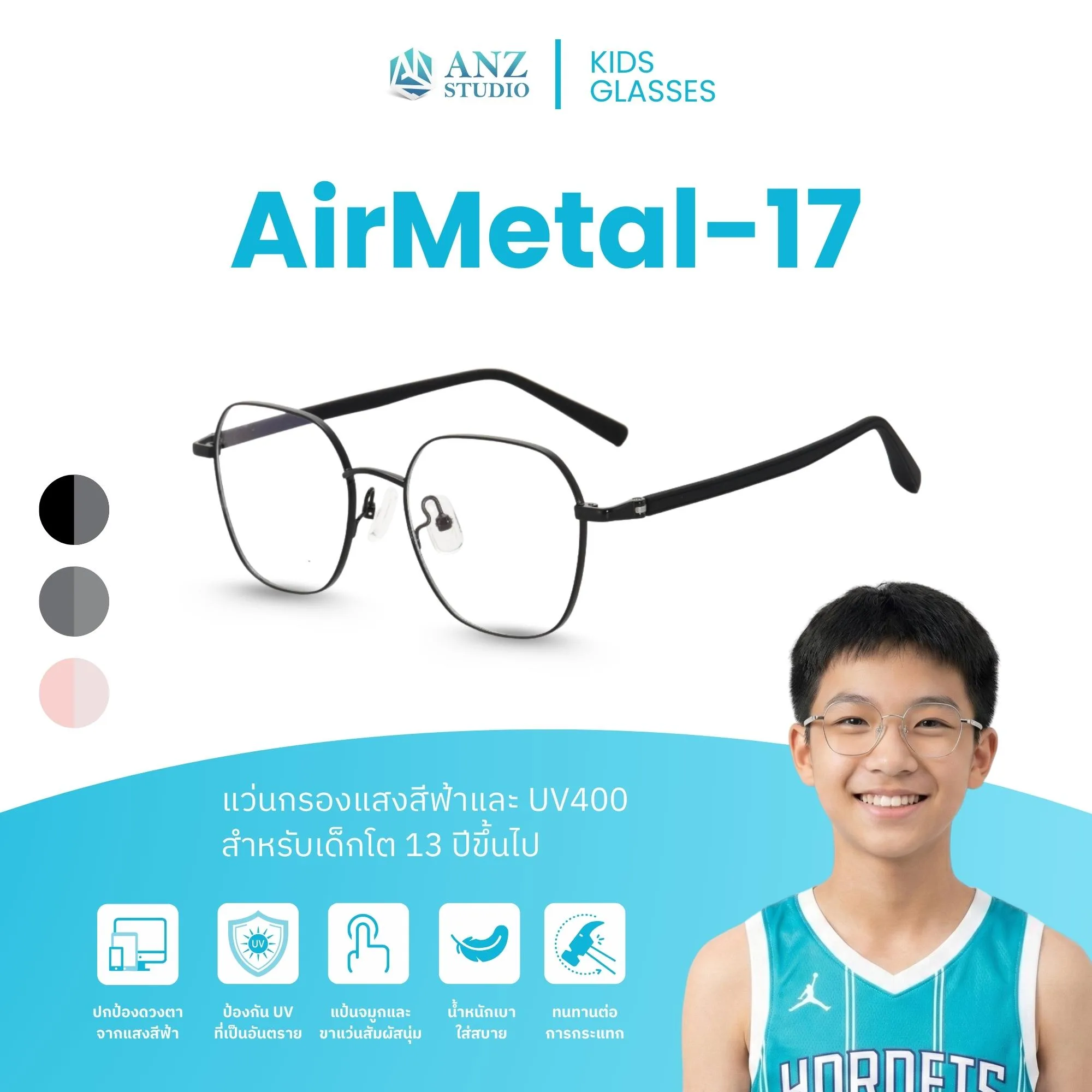แว่นตาพร้อมเลนส์กรองแสง ANZ รุ่น AirMetal-17 สำหรับเด็กโตและวัยรุ่นอายุ 13 ปีขึ้นไป