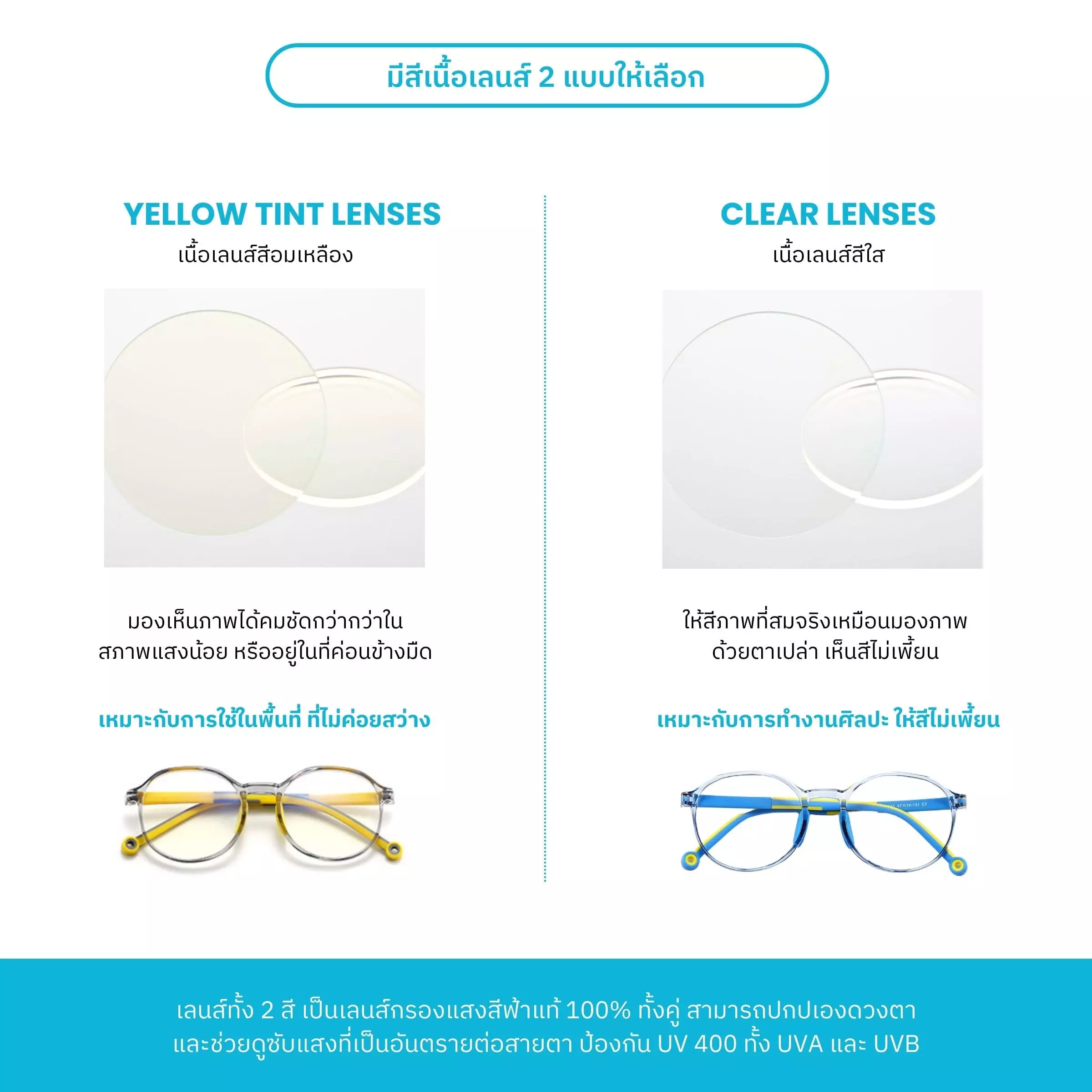 – ชนิดเลนส์ : Blue Block Lens (สีใสและสีเหลือง)