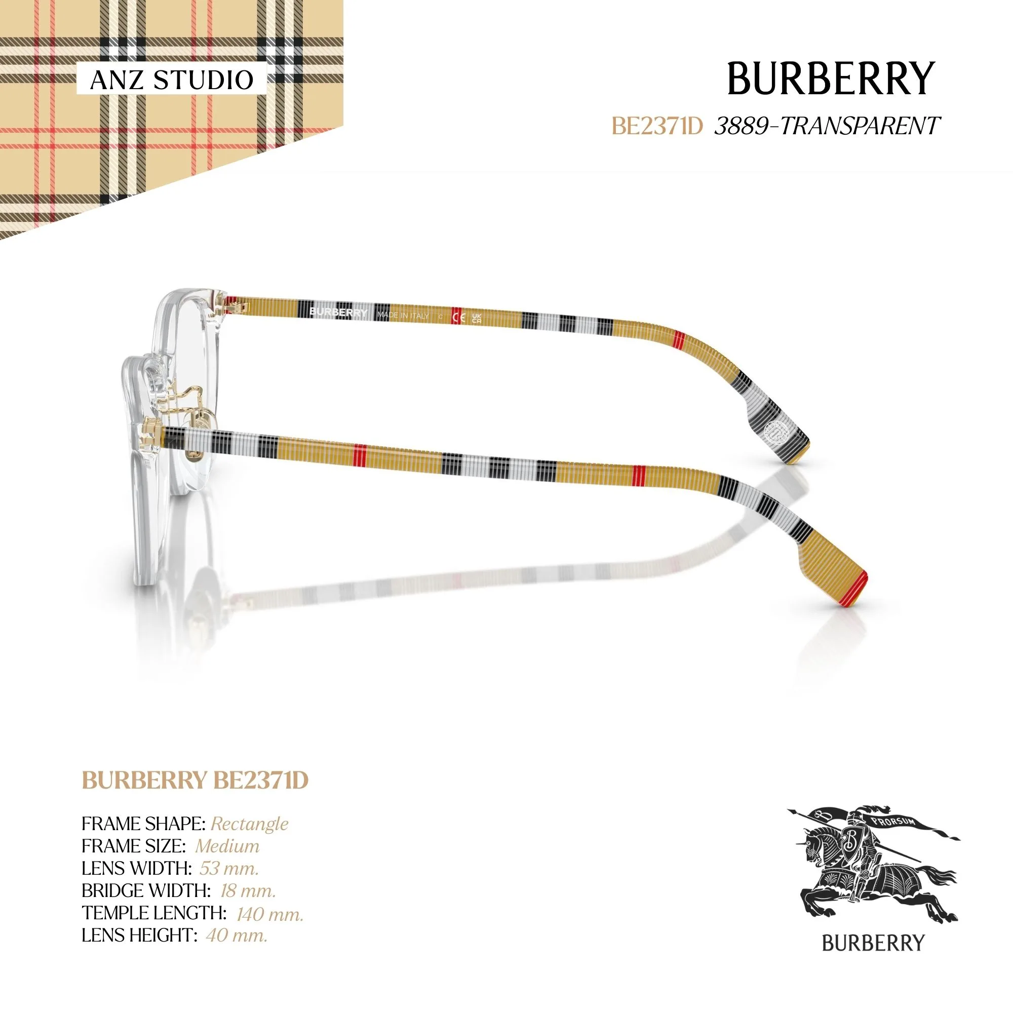 กรอบแว่นตา BURBERRY รุ่น BE2371D โดดเด่นด้วยดีไซน์ทรง Rectangle แบบเส้นโค้งนุ่มนวล (Soft Rectangle) ที่ให้ความทันสมัยและสวมใส่ง่ายในทุกลุค ตัวกรอบผลิตจากพลาสติกคุณภาพสูงผสานโลหะ ให้ความแข็งแรง เบาสบาย และทนทาน มาพร้อมแป้นจมูกโลหะปรับระดับได้ (Gooseneck Metal Nosepads) เพื่อให้เข้ากับรูปหน้าอย่างเป็นธรรมชาติ จุดเด่นของรุ่นนี้คือขาแว่นทรง Tubular ตกแต่งลาย Burberry Check เฉพาะรุ่นแบบสีพิเศษ ช่วยเพิ่มความโดดเด่นและอัตลักษณ์ของแบรนด์ มาพร้อมเลนส์เดโม่สำหรับนำไปตัดเลนส์สายตาตามความต้องการ