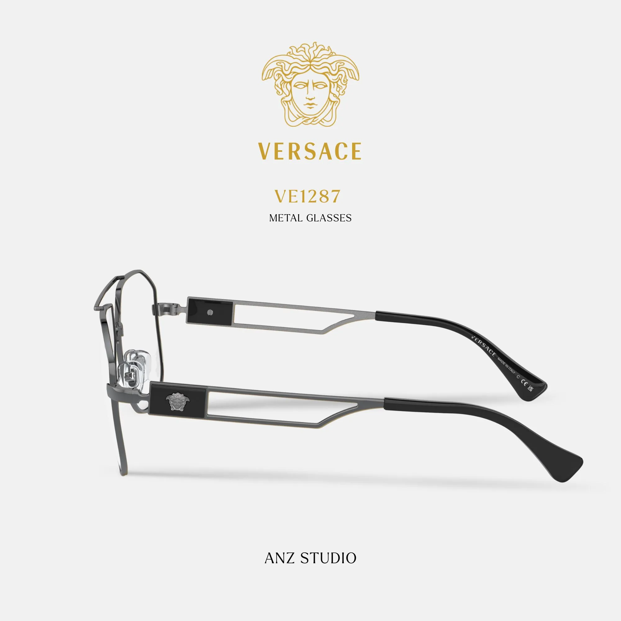 - รายละเอียดขาแว่นประดับโลโก้ Medusa สีทองไอคอนิก
