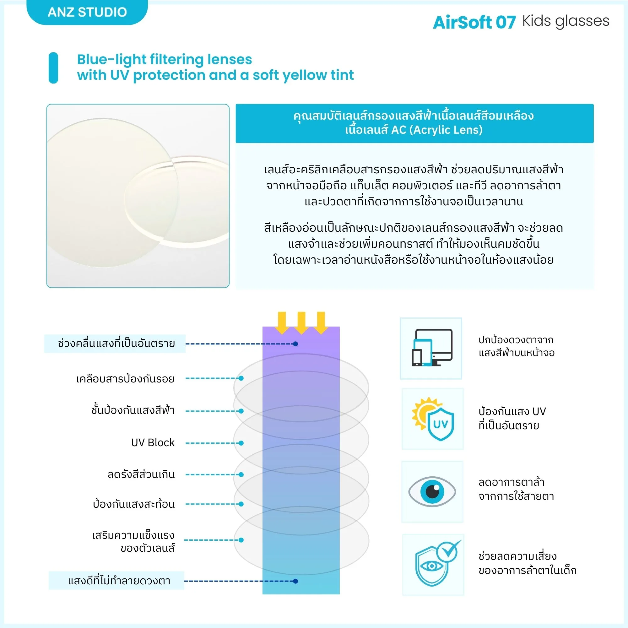เลนส์เป็น เลนส์กรองแสงสีฟ้าสำหรับเด็ก (Blue-light Filtering Kids Lens) เนื้อเลนส์ AC (Acrylic Lens) มีสีเหลืองอ่อนตามธรรมชาติ ช่วยลดแสงสีฟ้าในช่วงคลื่น 415–455 นาโนเมตร จากหน้าจอมือถือ แท็บเล็ต คอมพิวเตอร์ และทีวี พร้อมคุณสมบัติ UV Protection ช่วยป้องกันแสง UV ที่เป็นอันตรายต่อดวงตา ลดอาการล้าตา แสบตา และช่วยถนอมสายตาในช่วงวัยที่ดวงตายังอยู่ระหว่างการพัฒนา เหมาะสำหรับเด็กยุคดิจิทัลที่ต้องใช้หน้าจอเป็นประจำทั้งในและนอกห้องเรียน