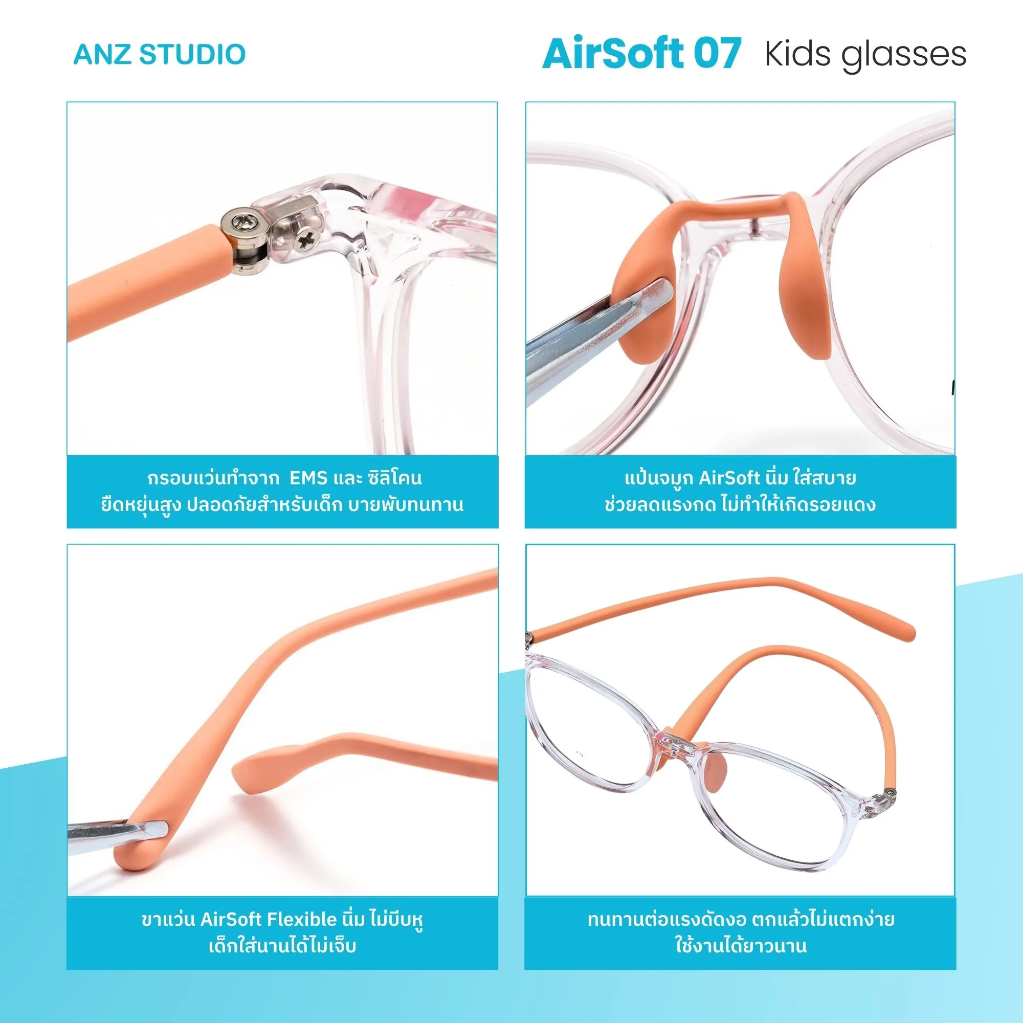 ANZ STUDIO แว่นกรองแสงสำหรับเด็ก รุ่น AirSoft 07 แป้นจมูกและขาแว่น AirSoft Flexible นิ่ม เบา ใส่สบาย