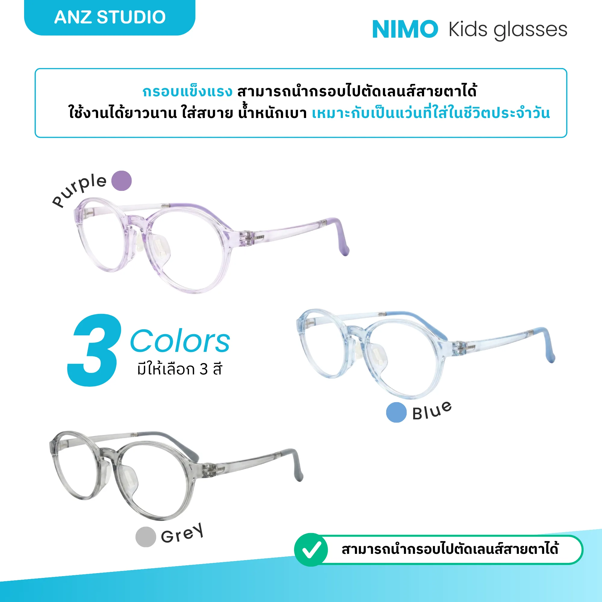 – วัสดุ : TR OPTICAL – CHILDREN น้ำหนักเบา ยืดหยุ่น รองรับการใช้งานของเด็ก