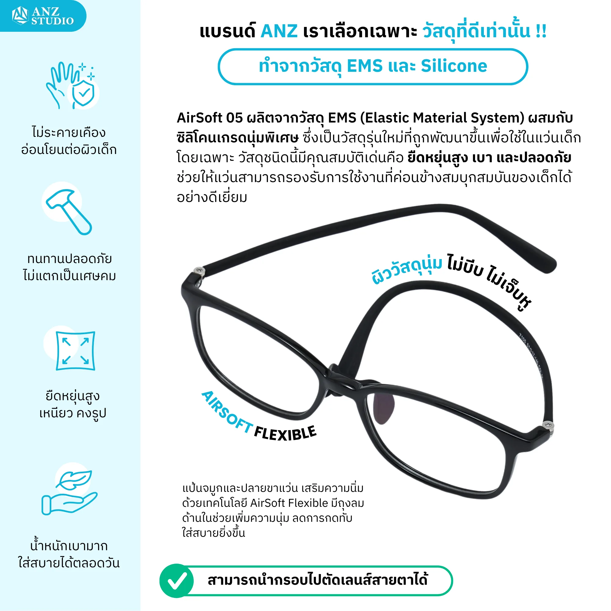ขาแว่นและแป้นจมูกเป็นแบบ AirSoft Flexible เนื้อวัสดุนุ่ม ไม่แข็ง ไม่บีบศีรษะ และไม่กดสันจมูก ช่วยลดรอยแดงและอาการเจ็บบริเวณใบหู เด็กสามารถใส่เรียน ใส่เล่น หรือใส่ใช้งานต่อเนื่องได้อย่างสบาย ไม่รู้สึกอึดอัดหรือระคายเคืองผิว